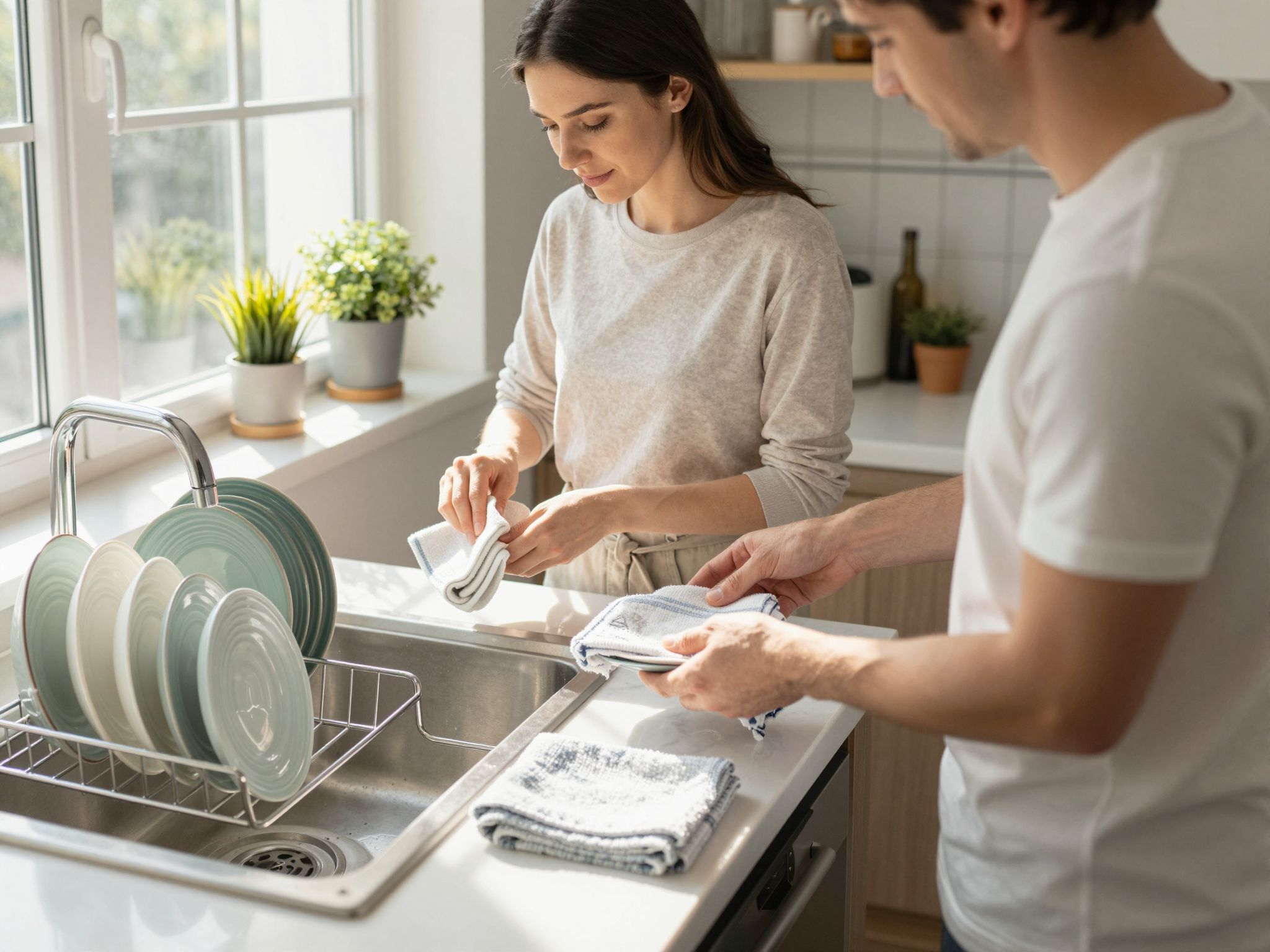 Ez a módszer minimalizálja a konyharuha használatát, csökkenti a baktériumátvitel esélyét, miközben biztosítja a gyors, foltmentes száradást. A legfontosabb, hogy a konyharuha csak a már szinte száraz felületek utolsó simítására szolgáljon, ne pedig a csepegő víz felszívására.